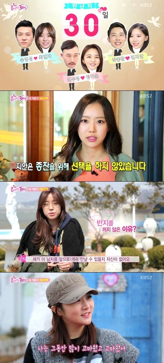 지난 14일 오후 방송된 KBS 2TV '두근두근 로맨스 30일'에서는 정다은 아나운서와 김주경 축구코치, 1역 연봉 플로리스트 최민지와 한의사 송영섭, 배우 박준규 아들 박종찬과 연기 전공 여대생 김지안이 30일 동안 연애를 하는 모습이 담겼다. 이 커플들은 연애기간 이후 최종 선택의 시간을 가졌지만 결국 모두 최종 커플 성사는 이뤄지지 않았다.
