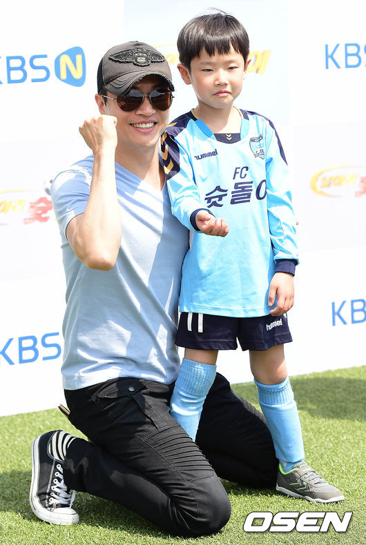 가수 김정민과 아들 도윤군이 15일 오후 경기도 남양주 종합운동장에서 열린 KBS N '날아라 슛돌이 시즌6' 현장공개에 참석해 포토타임을 갖고 있다.