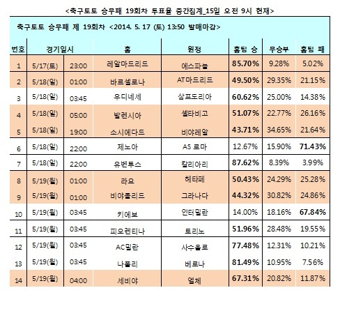 축구토토 승무패 19회차 투표율 중간집계 결과