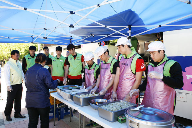 구미 LIG손해보험 그레이터스(단장 박주천)가 15일 수원 매탄공원에서 진행된 ‘사랑의 밥차’ 봉사활동에 참여했다.