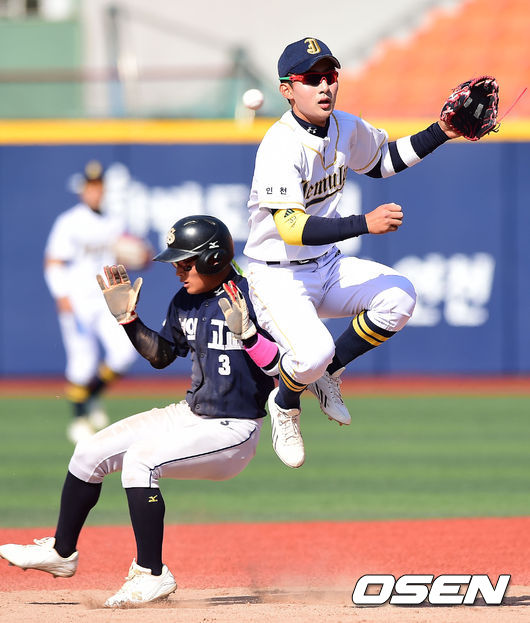 2회초 2사 1,3루 설악고 박정현이 2루 도루때 제물포고 포수 김태훈의 송구 실책으로 2루에 들어가고 있다.