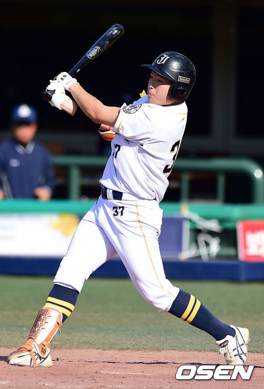 3회말 1사 2루 제물포고 정지원이 적시타를 때리고 있다.