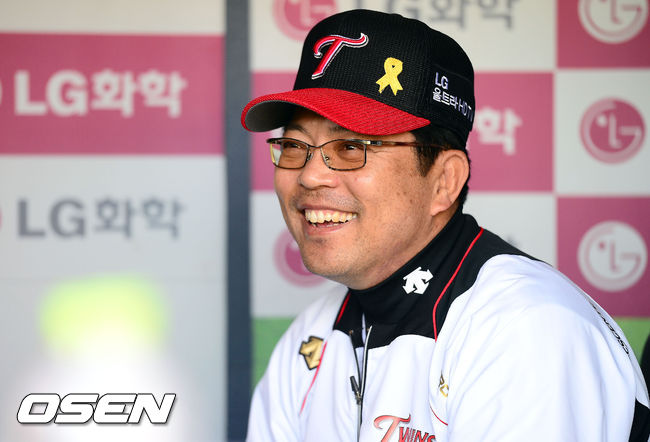 15일 오후 서울 잠실야구장에서 열린 '2014 한국야쿠르트 세븐 프로야구' LG 트윈스와 롯데 자이언츠의 경기에 앞서 LG 양상문 감독이 덕아웃에서 취재진들과 이야기를 나누고 있다.