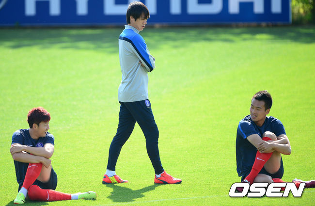 15일 오후 경기도 파주시 파주 NFC(대표팀 트레이닝센터)에서 브라질 월드컵에서 사상 첫 원정 8강에 도전하는 축구 국가대표팀이 훈련을 할때 홍명보 감독이 손흥민 김신욱과 얘기를 나누고 있다.