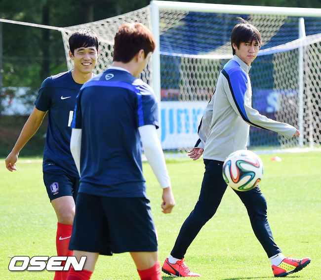 15일 오후 경기도 파주시 파주 NFC(대표팀 트레이닝센터)에서 브라질 월드컵에서 사상 첫 원정 8강에 도전하는 축구 국가대표팀이 훈련을 할때 홍명보 감독이 박주영과 이청용이 즐겁게 훈련하는 모습을 지켜보고 있다.
