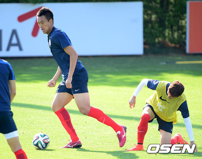 15일 오후 경기도 파주시 파주 NFC(대표팀 트레이닝센터)에서 브라질 월드컵에서 사상 첫 원정 8강에 도전하는 축구 국가대표팀이 훈련을 할때 김신욱이 이청용 볼을 뺏고 있다.
