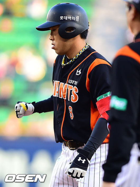 2회초, 1사 1,3루 1타점 적시타를 날린 롯데 전준우가 1루에서 주먹을 쥐며 기뻐하고 있다.