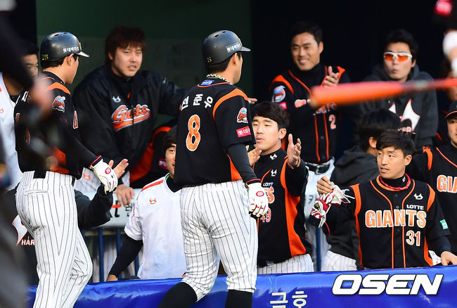 2회초, 2사 1,2루 롯데 김문호의 2타점 적시타로 홈을 밟은 1루주자 전준우와 2루주자 황재균이 덕아웃에서 동료들로부터 환영으 받고 있다.