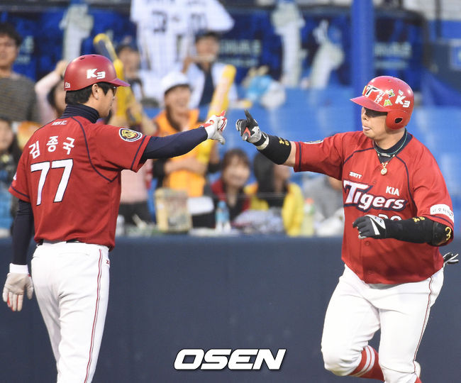 15일 오후 창원시 마산구장에서 열린 '2014 한국야쿠르트 세븐 프로야구' NC 다이노스와 KIA 타이거즈 경기,4회초 무사 나지완 백투백 홈런을 날리고 김종국 코치의 환영을 받으며 그라운드를 돌고 있다.