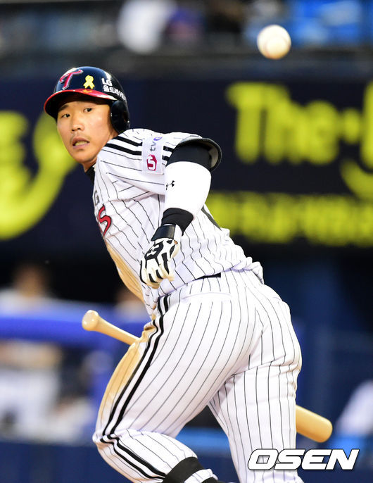 4회말 무사 1루에서 LG 박경수가 보내기 번트를 시도하고 타구를 바라보고 있다.