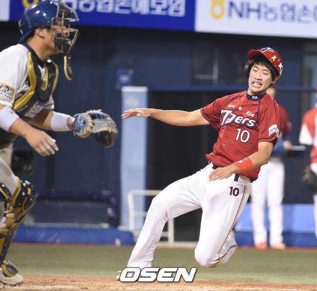 15일 오후 창원시 마산구장에서 열린 '2014 한국야쿠르트 세븐 프로야구' NC 다이노스와 KIA 타이거즈 경기,5회초 1사 1,2루 이종환의 2루수앞 땅볼때 NC 내야진의 실책을 틈타 2루주자 강한울 홈까지 쇄도 득점을 올리고 있다.