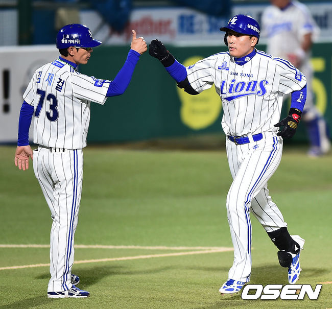 15일 대구구장에서 열린 '2014 한국야쿠르트 세븐 프로야구' 삼성 라이온즈와 한화 이글스의 경기, 4회말 2사 1루 삼성 이승엽이 역전 2점 홈런을 날리고 김재걸 코치와 하이파이브를 하고 있다.