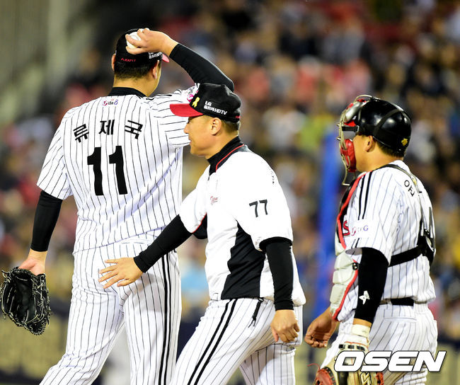 5회초 2사 2,3루에서 LG 류제국이 강판당하고 있다.