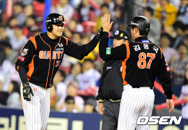 5회초 2사 만루에서 롯세 박종윤이 2타점 적시타를 날리고 김응국 코치와 하이파이브를 하고 있다.