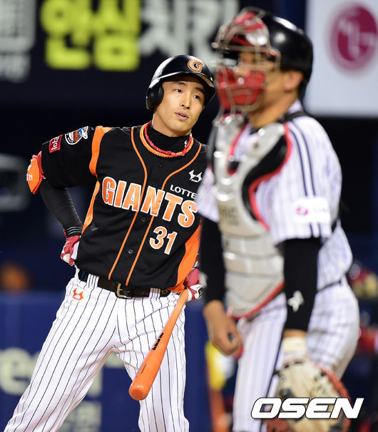 5회초 1사 2,3루에서 롯데 손아섭이 LG 류제국이 고의4구로 거르자 아쉬워하고 있다.