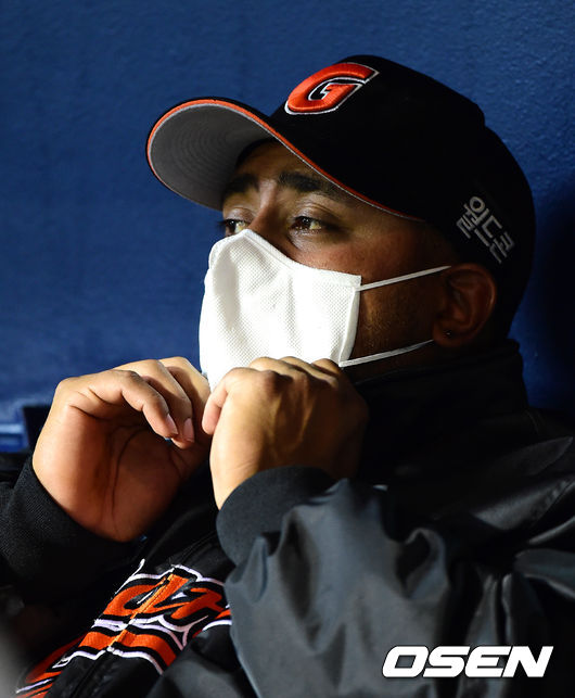 롯데 히메네스가 감기 몸살로 라인업에서 제외, 더그아웃에서 경기를 지켜보고 있다.