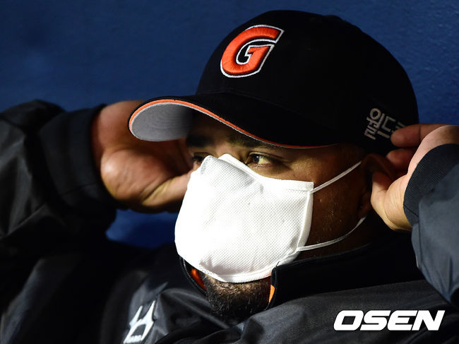 롯데 히메네스가 감기 몸살로 라인업에서 제외, 더그아웃에서 경기를 지켜보고 있다.