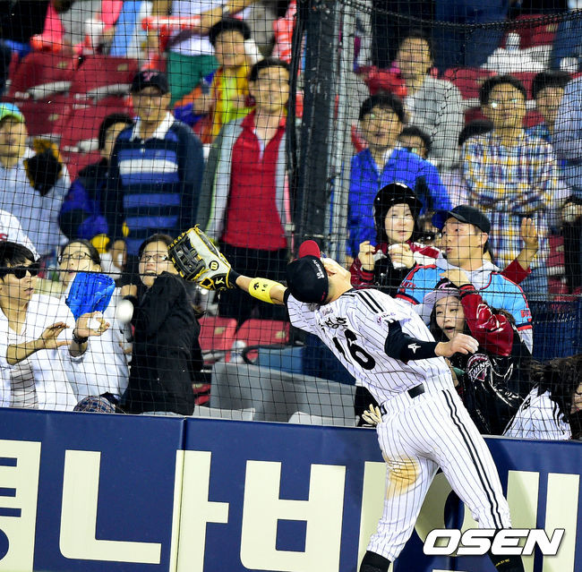 7회초 2사에서 LG 정성훈이 롯데 강민호의 파울타구를 놓치고 있다.