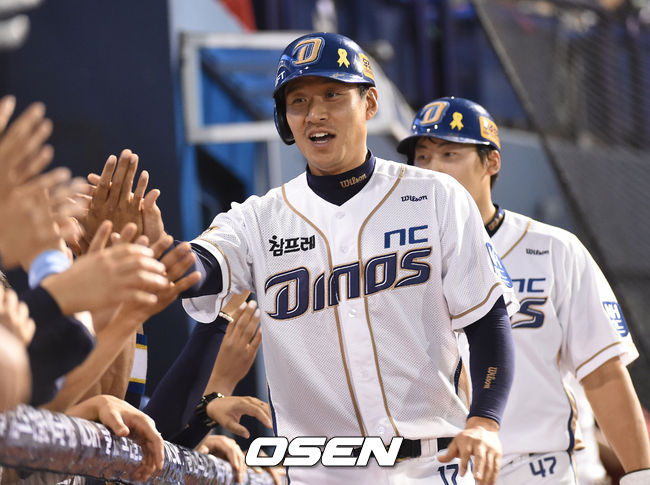 15일 오후 창원시 마산구장에서 열린 '2014 한국야쿠르트 세븐 프로야구' NC 다이노스와 KIA 타이거즈 경기,8회말 1사 1,2루 이상호의 2타점 적시타때 조영훈 득점을 올리며 덕아웃 동료의 환영을 받고 있다.