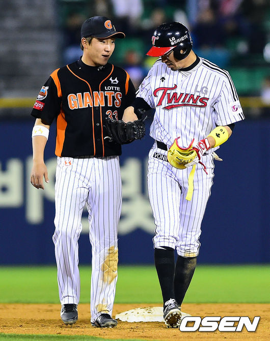 7회말 선두타자 정성훈이 오른쪽 2루타를 날린뒤 2루수 롯데 정훈으로부터 1700안타 기념공을 건네받고 있다.
