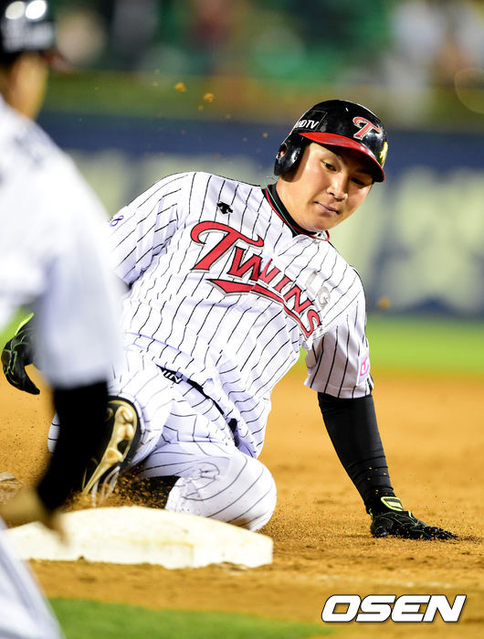 8회말 무사 2,3루에서 LG 오지환이 2타점 적시 3루타를 날리고 슬라이딩하며 세이프되고 있다.
