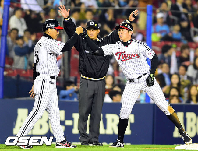 8회말 무사 2,3루 2타점 적시타를 날린 오지환이 3루에서 최태원 코치와 주먹을 맞추고 있다.