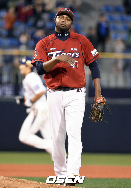 15일 오후 창원시 마산구장에서 열린 '2014 한국야쿠르트 세븐 프로야구' NC 다이노스와 KIA 타이거즈 경기,9회말 2사 2루 나성범에게 투런 홈런을 허용한 어센시오가 아쉬워하고 있다.