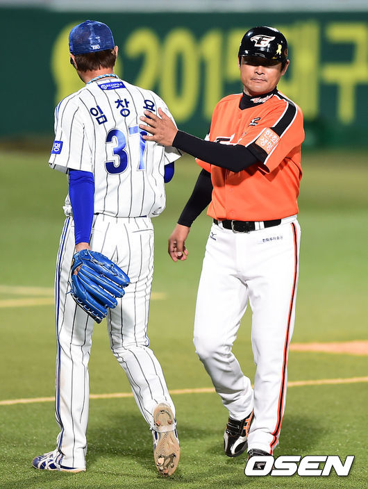 15일 대구구장에서 열린 '2014 한국야쿠르트 세븐 프로야구' 삼성 라이온즈와 한화 이글스의 경기,9회초 동점을 허용한 삼성 임창용 투수가 이닝종료 후 한화 이종범 코치의 격려를 받으며 더그아웃으로 들어가고 있다.