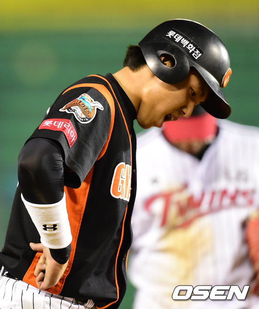 9회초 무사에서 롯데 김문호가 3루타를 날리고 싸이클링히트를 놓친것에 아쉬워하고 있다. 김문호는 싸이클링히트까지 홈런만 남기고 있었다.