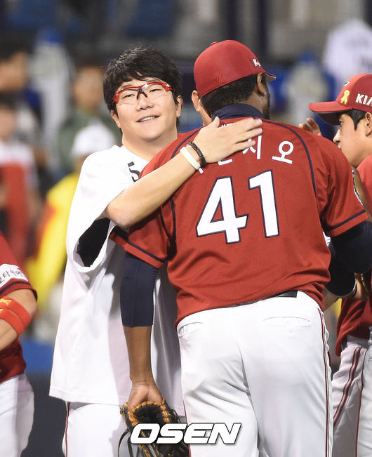 경기 종료후 선발 승리 양현종이 어센시오와 승리의 기쁨을 나누고 있다./ ajyoung@osen.co.kr