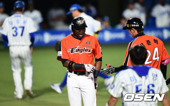 15일 대구구장에서 열린 '2014 한국야쿠르트 세븐 프로야구' 삼성 라이온즈와 한화 이글스의 경기,9회초 2사 만루 삼성 임창용 마무리 투수의 폭투를 틈타 한화 3루 주자 피에가 동점 성공하고 있다