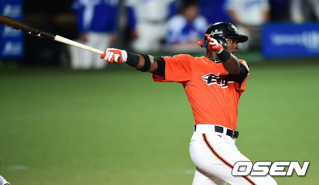15일 대구구장에서 열린 '2014 한국야쿠르트 세븐 프로야구' 삼성 라이온즈와 한화 이글스의 경기,연장 12회초 2사 1,3루 한화 피에가 역전 1타점 적시타를 날리고 있다.