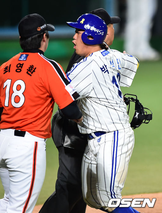 12회말 2사 1,2루 삼성 김상수의 동점 적시타때 2루 주자 박석민이 홈을 밟은 후 구심과 충돌하고 있다./ soul1014@osen.co.kr