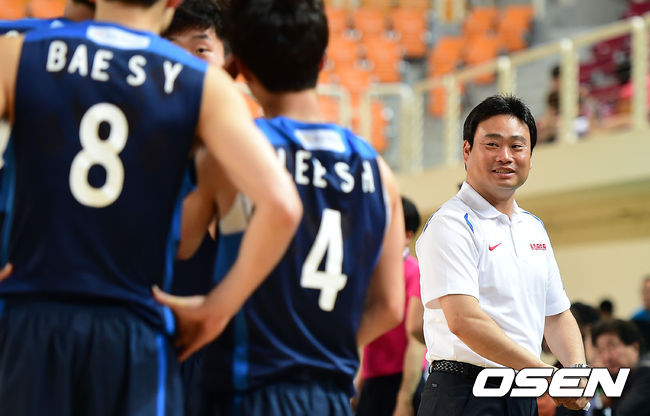 대학농구 대표팀 황준삼 감독이 선수들을 바라보고 있다.