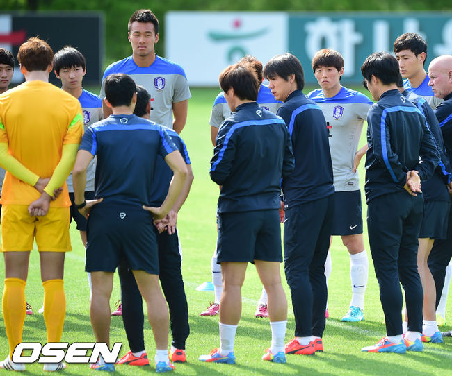 16일 오후 경기도 파주시 파주 NFC(대표팀 트레이닝센터)에서 브라질 월드컵에서 사상 첫 원정 8강에 도전하는 축구 국가대표팀이 훈련을 할 때 홍명보 감독이 선수들에게 말을 하고 있다.