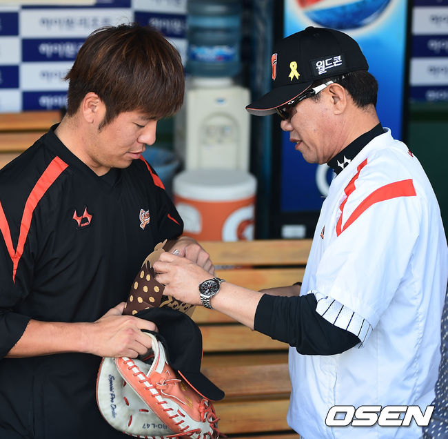 16일 오후 부산 사직구장에서 열린 2014 한국야쿠르트 세븐 프로야구 롯데 자이언츠와 넥센 히어로즈의 경기전 롯데 김시진 감독이 팬에게서 선물 받은 강민호의 과자를 탐내고 있다.
