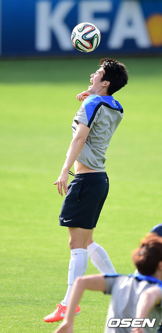 16일 오후 경기도 파주시 파주 NFC(대표팀 트레이닝센터)에서 브라질 월드컵에서 사상 첫 원정 8강에 도전하는 축구 국가대표팀이 훈련을 할 때 기성용이 헤딩에 실패하고 있다.