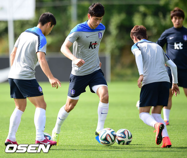16일 오후 경기도 파주시 파주 NFC(대표팀 트레이닝센터)에서 브라질 월드컵에서 사상 첫 원정 8강에 도전하는 축구 국가대표팀이 훈련을 할 때 이근호 지동원 이청용이 교차 드리블 훈련을 하고 있다.