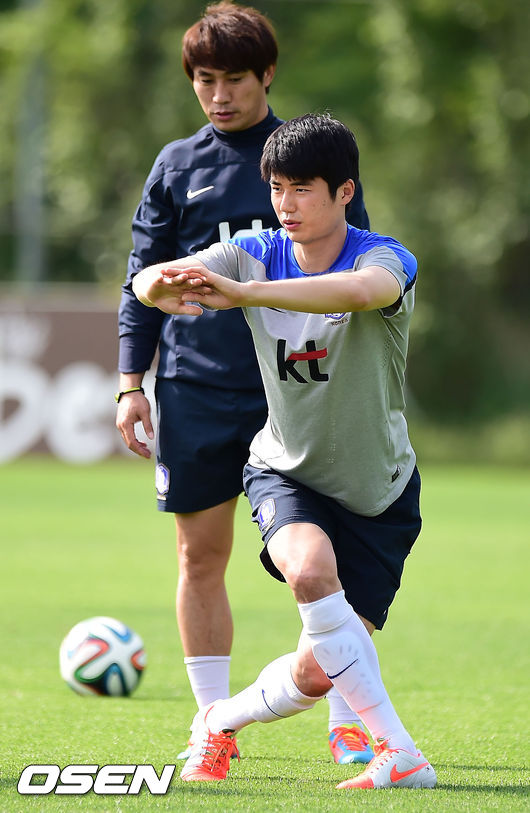 16일 오후 경기도 파주시 파주 NFC(대표팀 트레이닝센터)에서 브라질 월드컵에서 사상 첫 원정 8강에 도전하는 축구 국가대표팀이 훈련을 할 때 기성용이 몸을 풀고 있다.
