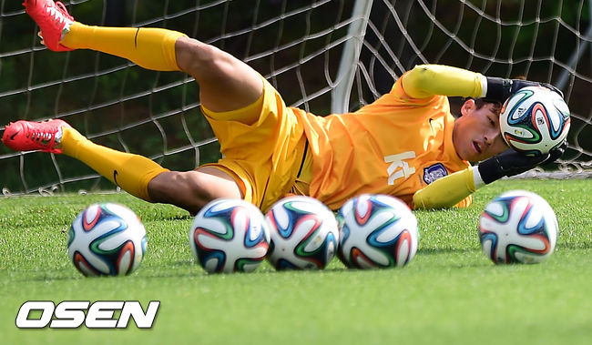 16일 오후 경기도 파주시 파주 NFC(대표팀 트레이닝센터)에서 브라질 월드컵에서 사상 첫 원정 8강에 도전하는 축구 국가대표팀이 훈련을 할 때 김승규가 수비 훈련을 하고 있다.