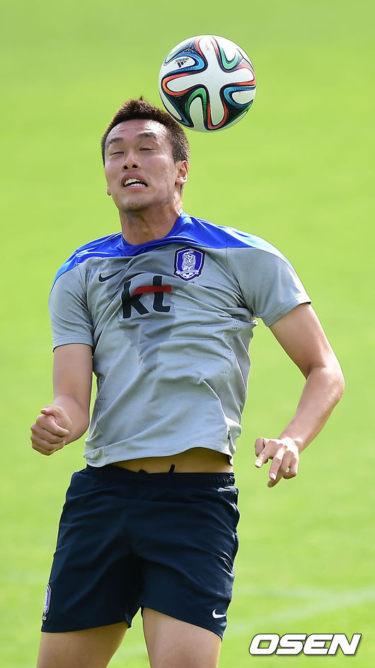 16일 오후 경기도 파주시 파주 NFC(대표팀 트레이닝센터)에서 브라질 월드컵에서 사상 첫 원정 8강에 도전하는 축구 국가대표팀이 훈련을 할 때 김신욱이 헤딩훈련을 하고 있다.