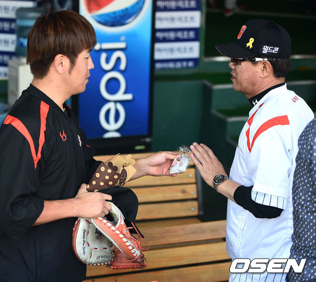 16일 오후 부산 사직구장에서 열린 2014 한국야쿠르트 세븐 프로야구 롯데 자이언츠와 넥센 히어로즈의 경기전 롯데 강민호가 여성 팬들에게 받은 과자 선물을 김시진 감독에게 건네고 있다.