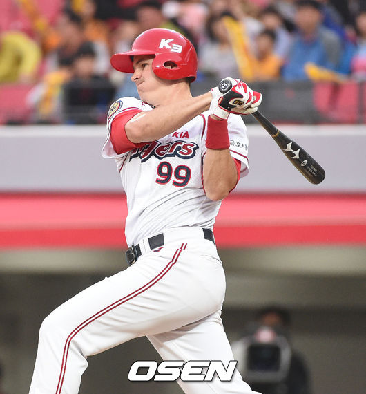 16일 오후 광주 KIA 챔피언스필드에서 열린 '2014 한국야쿠르트 세븐 프로야구' KIA 타이거즈와 삼성 라이온즈 경기,1회말 무사 3루 필 1타점 적시타를 날리고 있다.