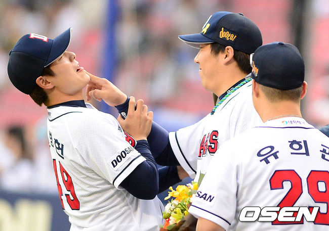 경기에 앞서 두산 민병헌이 팀 4월 MVP를 수상하고 김현수의 축하를 받으며 장난치고 있다.
