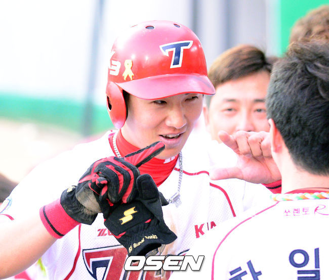16일 오후 광주 KIA 챔피언스필드에서 열린 '2014 한국야쿠르트 세븐 프로야구' KIA 타이거즈와 삼성 라이온즈 경기,1회말 1사 3루 필의 적시타때 3루주자 이대형 선취득점을 올리며 동료들의 환영을 받고 있다.