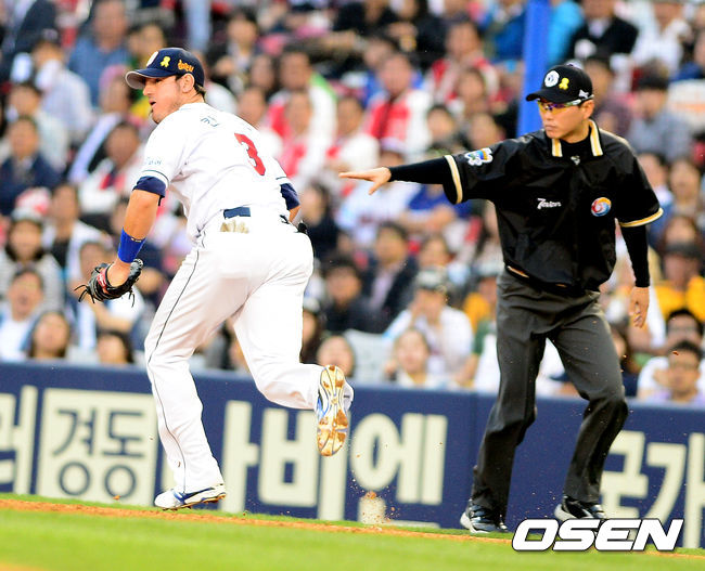 2회초 무사 1,2루에서 두산 칸투가 NC 이종욱의 1루 땅볼에 실책을 범하고 주자를 바라보고 있다.