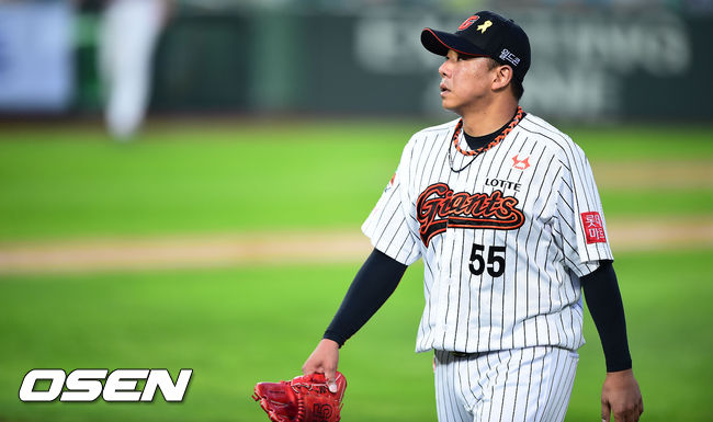 16일 오후 부산 사직구장에서 열린 2014 한국야쿠르트 세븐 프로야구 롯데 자이언츠와 넥센 히어로즈의 경기, 2회초 1실점 허용한 롯데 선발투수 김사율이 이닝종료 후 더그아웃으로 들어가고 있다.