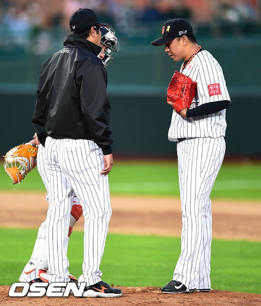 16일 오후 부산 사직구장에서 열린 2014 한국야쿠르트 세븐 프로야구 롯데 자이언츠와 넥센 히어로즈의 경기, 2회초 2사 넥센 로티노에게 볼넷 허용하며 만루위기를 맞은 롯데 선발투수 김사율이 정민태 투수코치와 마운드에서 이야기를 나누고 있다.