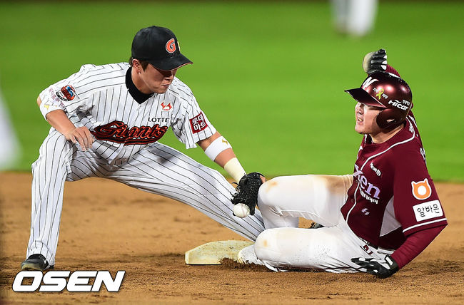 16일 오후 부산 사직구장에서 열린 2014 한국야쿠르트 세븐 프로야구 롯데 자이언츠와 넥센 히어로즈의 경기,4회초 2사 1루 넥센 로티노의 타석때 1루 주자 유한준이 도루 성공하고 있다.