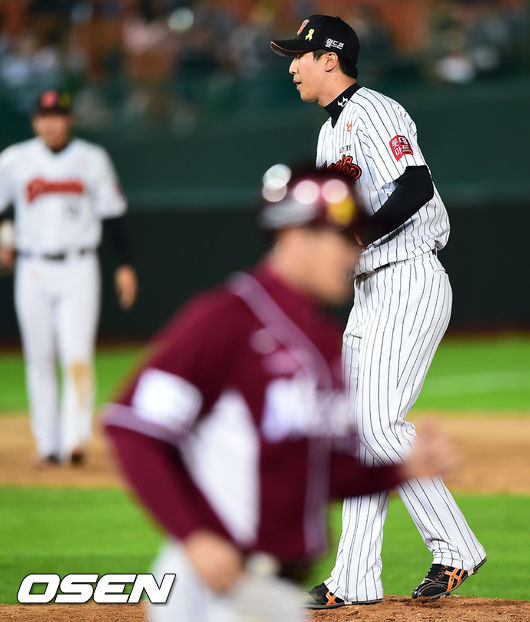 16일 오후 부산 사직구장에서 열린 2014 한국야쿠르트 세븐 프로야구 롯데 자이언츠와 넥센 히어로즈의 경기,5회초 2사 만루 롯데 배장호 투수가 스트레이트 밀어내기 볼넷을 실점한 뒤 아쉬워하고 있다.
